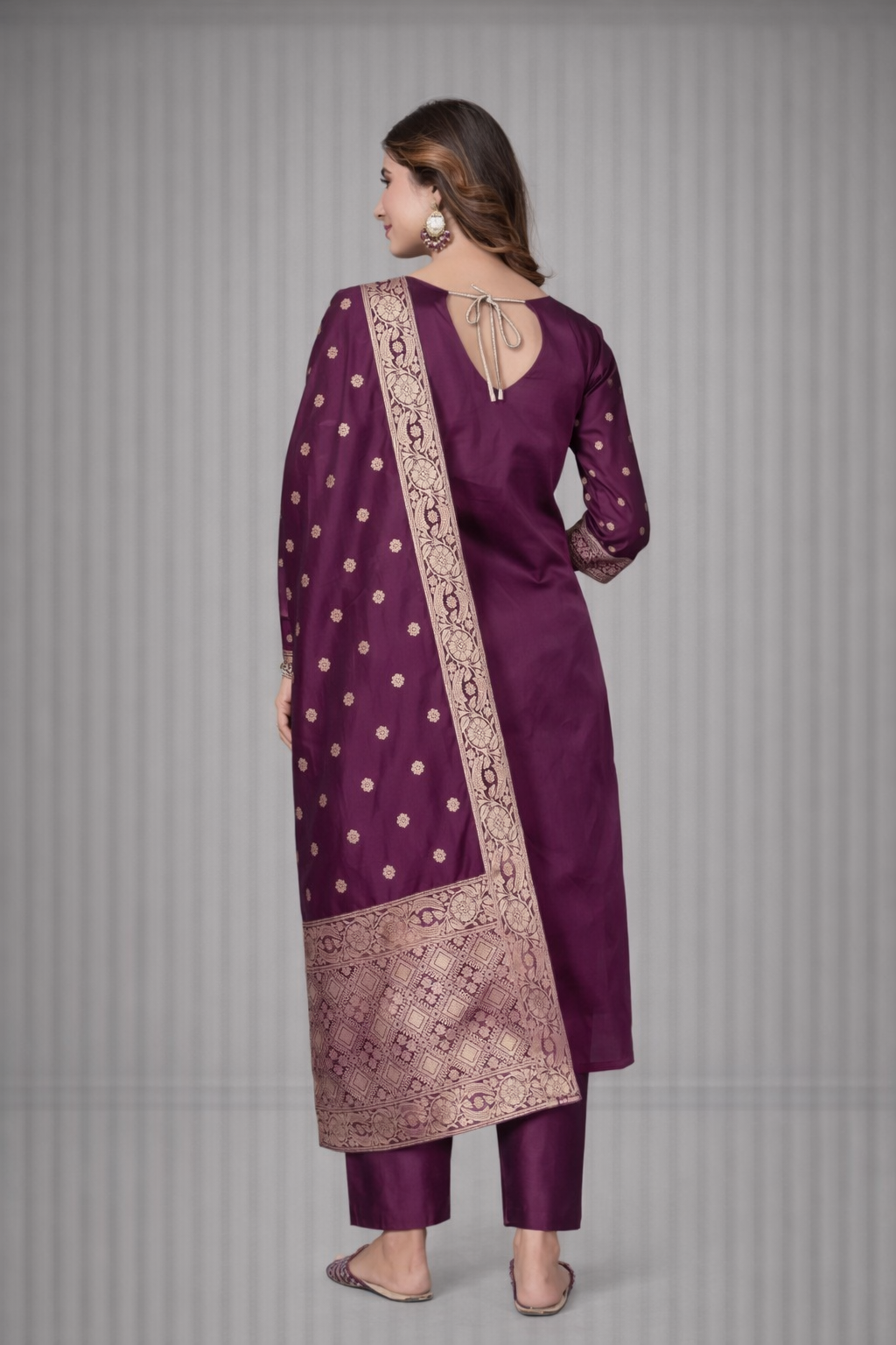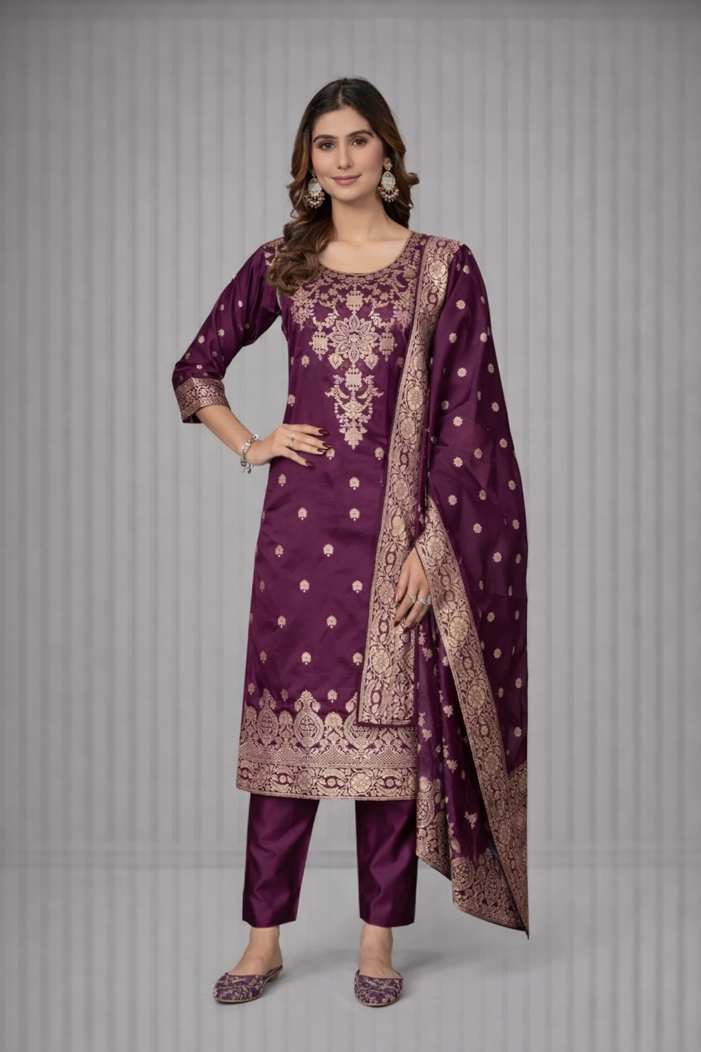 Paired with coordinated art silk bottoms and a softly draped dupatta, this stitched three-piece set is ideal for festive gatherings, cultural celebrations, and elegant evenings. Timeless in appeal and effortless to wear, Kashvi Élan reflects MODEUK’s philosophy of understated luxury.