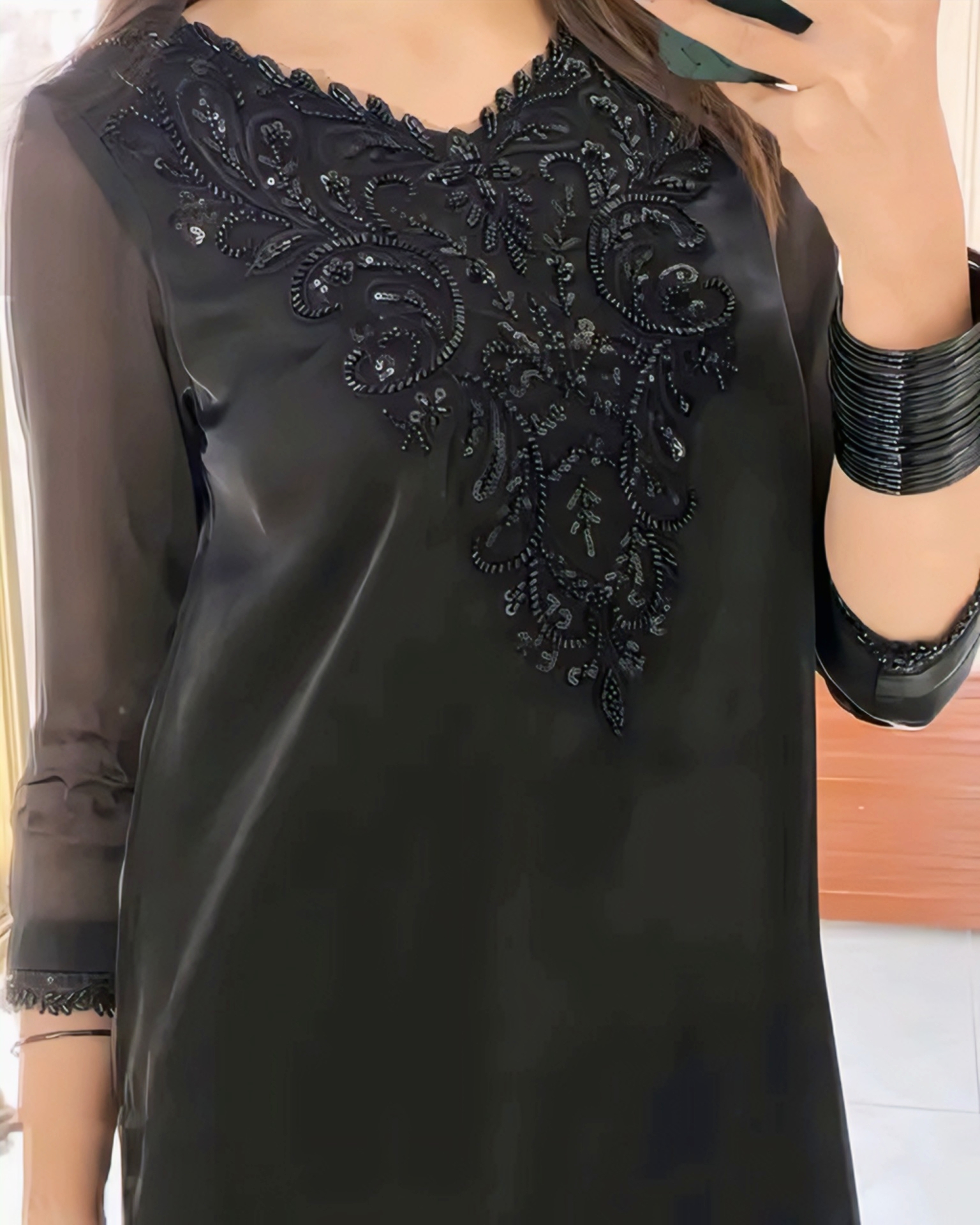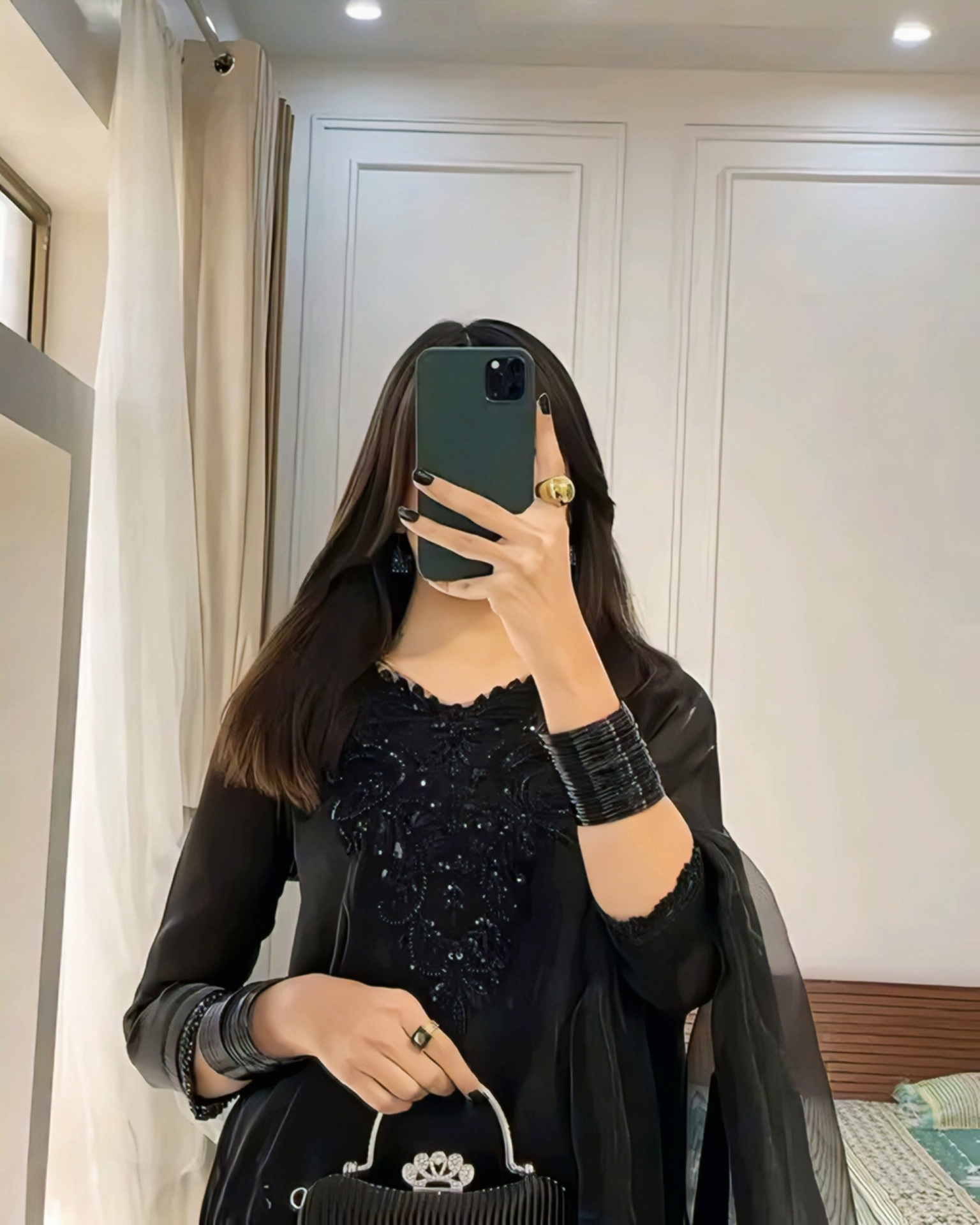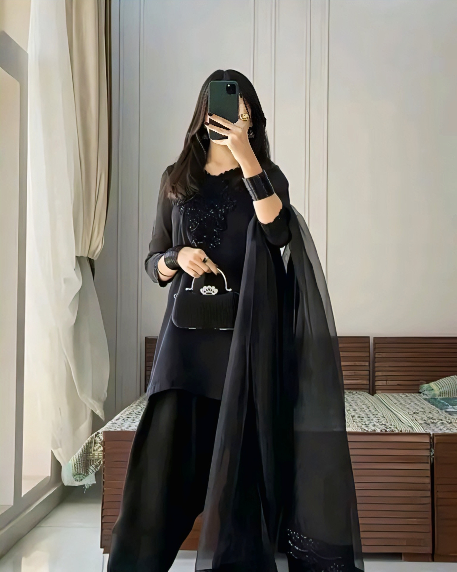 The Noir Enchanté Embroidered Crepe Ensemble from MODEUK is a study in understated glamour. Crafted from soft, flowing crepe in a deep black hue, this three-piece set balances modern design with traditional artistry.